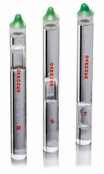 Tubos para viscosidad llenos* Medicion de viscosidad por el metodo "rising buble"( bulbo de aire) por comparacion diferentes stokes Mca. Gardner- el líquido de los patrones está cerradoherméticamente en tubos de vidrio caducidad de 5 añoslos tubos no poseen orificios críticos cuyo ensuciamiento podría causar unas medicioneserróneas se pueden realizar mediciones de repetición con facilidad, mientras la temperatura se mantenga constanteEl tiempo durante el que la burbuja sube es directamente proporcional a la viscosidad del líquido; cuanto más rápido sube la burbuja, menor es la viscosidad. Los viscosí metros de BYK-Gardner están divididos en 4 juegos alfanuméricos, desde A5 hasta Z10. Cubren un margen de viscosidad desde 0,005 hasta 1,000 stokes.