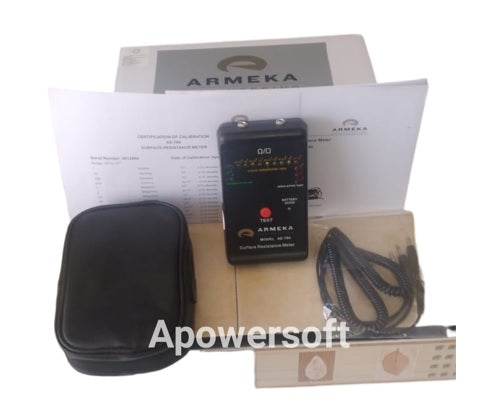 El medidor de resistencia de superficie AE-780 es un comprobador fácil de usar para medir la resistividad de la superficie. Este medidor está diseñado para ser utilizado en todas las facetas de producción de materiales, incluyendo ingeniería, mantenimiento, control de calidad, inspección entrante, fabricación, investigación o departamentos de ventas para la prueba de tapetes antiestáticos, acabados para pisos, pinturas, muñequeras, batas, calzado, bolsos y contenedores.Al utilizar los electrodos incorporados, los valores de prueba del medidor para la resistividad de la superficie están expresados en ohmios por cuadrado (aunque se muestran en ohmios). Al usar los electrodos externos de cinco libras, los valores de prueba del medidor para la resistencia están en ohmios.