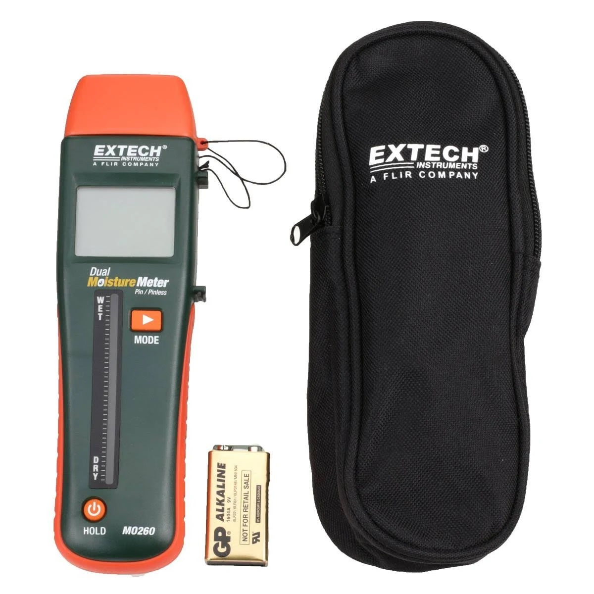 El Extech MO260 es un medidor de humedad combinado, con o sin clavijas, que puede medir la humedad relativa de la madera y otros materiales de construcción mediante una tecnología sin clavijas, y determinar el porcentaje de humedad de placas de yeso y otros materiales con el método de clavijas directo. Las mediciones se muestran en una pantalla digital de LCD con retroiluminación y una gráfica de barras de LED tricolor. Profundidad de medición no invasiva sin clavijas de hasta 22 mm (0.75″) por debajo de la superficie. Incluye batería de 9 V, clavijas de repuesto, tapa protectora y estuche.