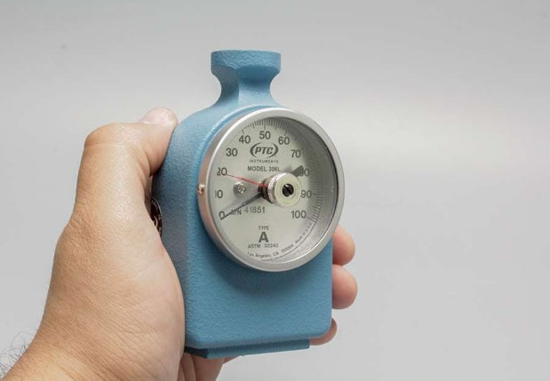 El instrumento tiene un dial de aluminio de bajo brillo con negrita, fácil de leer números. El durómetro viene estándar con una mano Max Hold que conserva el pico lectura, una perilla superior con rosca de 8-32 permite tanto fácil uso y fijación manual a los puestos de prueba o el accesorio.